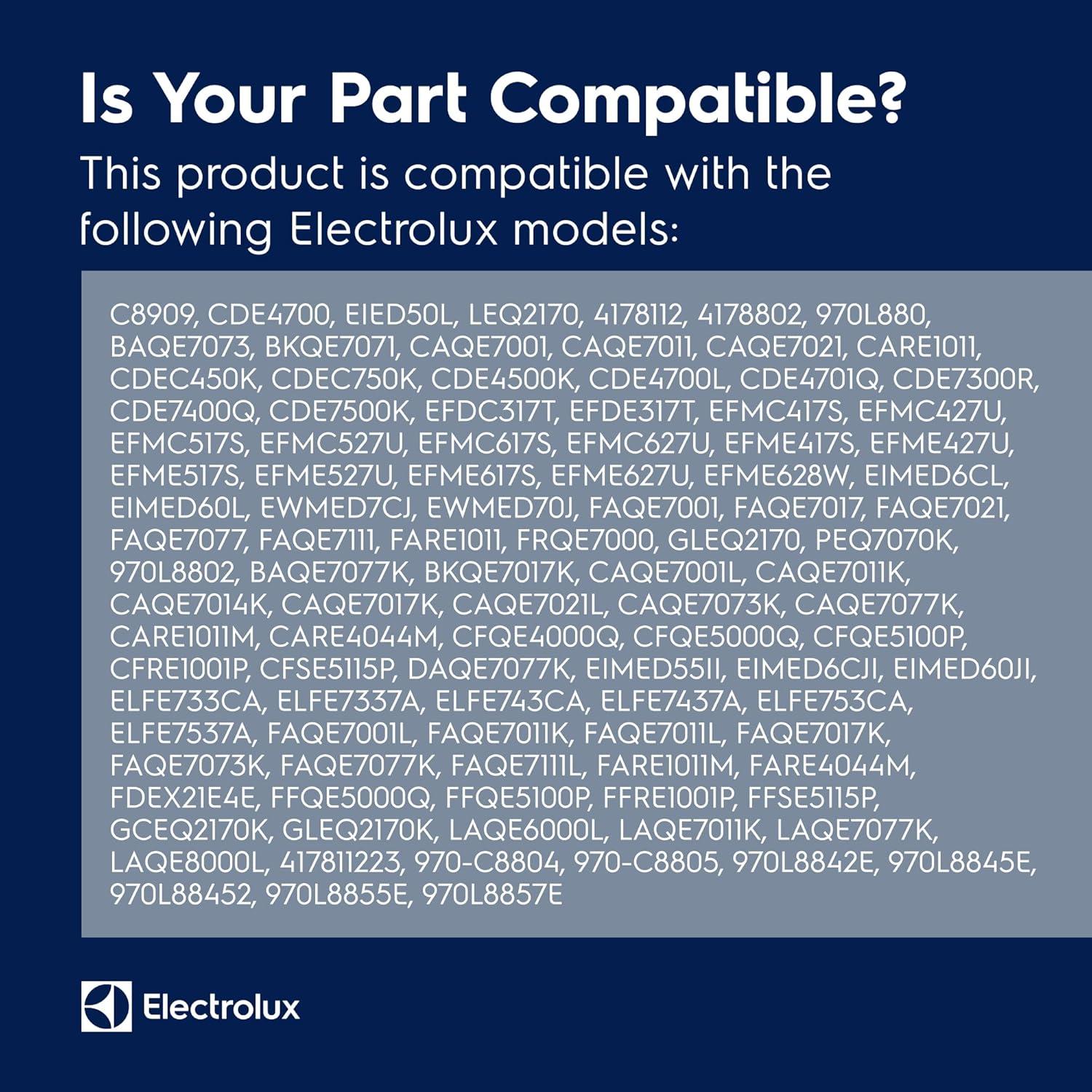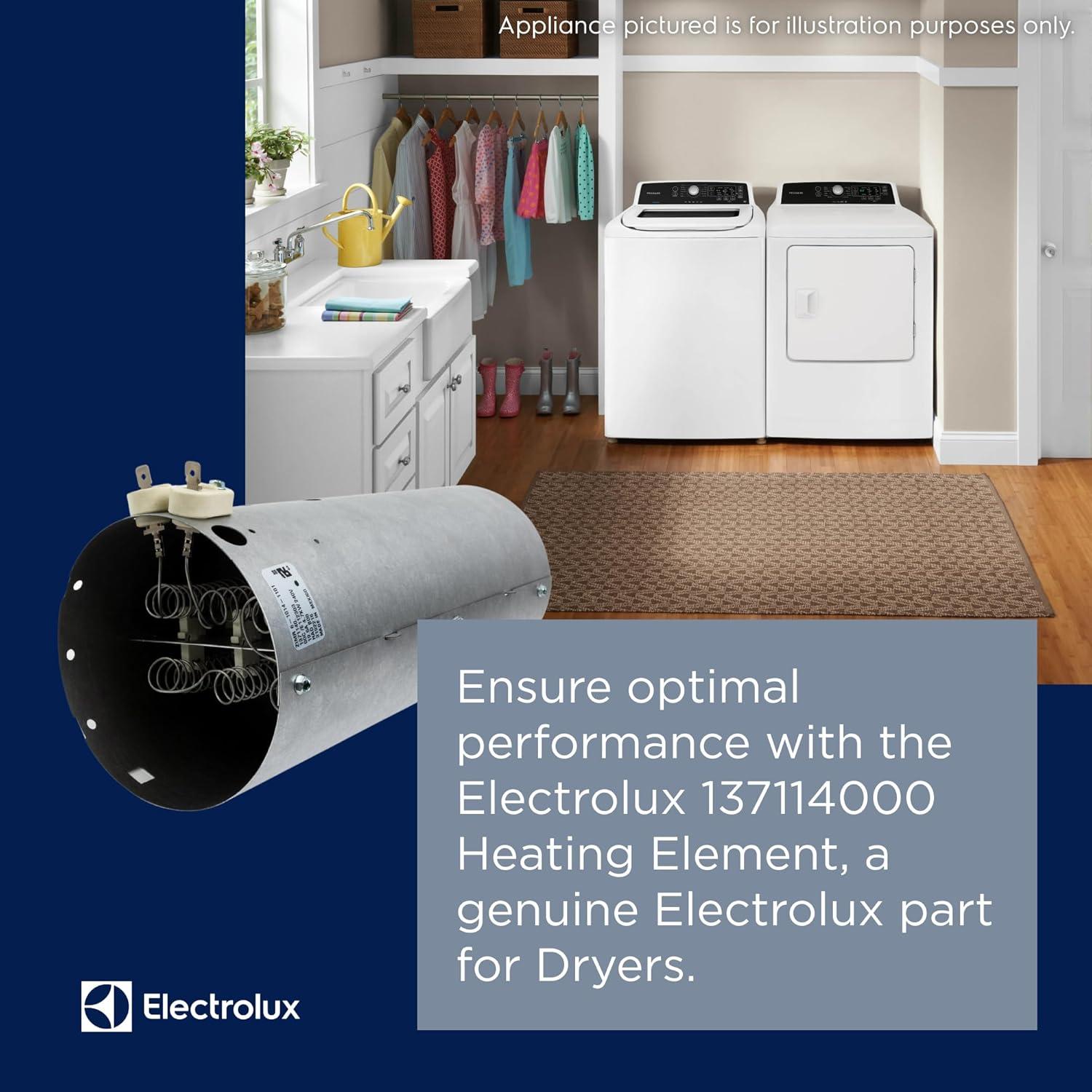 Repair your appliance with this genuine Electrolux 137114000 Heating Element. Genuine Electrolux parts are engineered to exact specifications, which, unlike non-genuine parts, ensures optimal performance of your appliance. Verify compatibility with your specific model before purchasing. This package weighs 2.77 lbs and measures 14.38 x 6.5 x 6.25 inches. This genuine Electrolux product is compatible with the following Electrolux models: C8909, CDE4700, EIED50L, LEQ2170, 4178112, 4178802, 970L880, BAQE7073, BKQE7071, CAQE7001, CAQE7011, CAQE7021, CARE1011, CDEC450K, CDEC750K, CDE4500K, CDE4700L, CDE4701Q, CDE7300R, CDE7400Q, CDE7500K, EFDC317T, EFDE317T, EFMC417S, EFMC427U, EFMC517S, EFMC527U, EFMC617S, EFMC627U, EFME417S, EFME427U, EFME517S, EFME527U, EFME617S, EFME627U, EFME628W, EIMED6CL, EIMED60L, EWMED7CJ, EWMED70J, FAQE7001, FAQE7017, FAQE7021, FAQE7077, FAQE7111, FARE1011, FRQE7000, GLEQ2170, PEQ7070K, 970L8802, BAQE7077K, BKQE7017K, CAQE7001L, CAQE7011K, CAQE7014K, CAQE7017K, CAQE7021L, CAQE7073K, CAQE7077K, CARE1011M, CARE4044M, CFQE4000Q, CFQE5000Q, CFQE5100P, CFRE1001P, CFSE5115P, DAQE7077K, EIMED55II, EIMED6CJI, EIMED60JI, ELFE733CA, ELFE7337A, ELFE743CA, ELFE7437A, ELFE753CA, ELFE7537A, FAQE7001L, FAQE7011K, FAQE7011L, FAQE7017K, FAQE7073K, FAQE7077K, FAQE7111L, FARE1011M, FARE4044M, FDEX21E4E, FFQE5000Q, FFQE5100P, FFRE1001P, FFSE5115P, GCEQ2170K, GLEQ2170K, LAQE6000L, LAQE7011K, LAQE7077K, LAQE8000L, 417811223, 970-C8804, 970-C8805, 970L8842E, 970L8845E, 970L88452, 970L8855E, 970L8857E