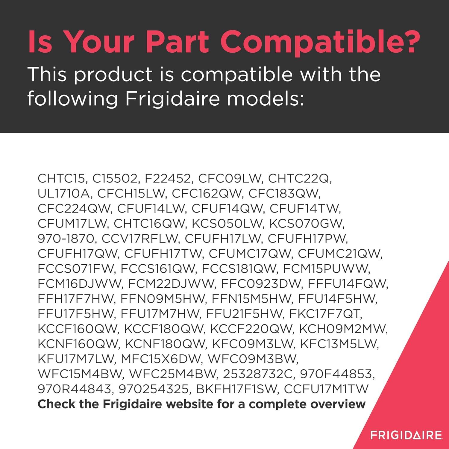 Repair your appliance with this genuine Frigidaire 297286802 Run Capacitor. Genuine Frigidaire parts are engineered to exact specifications, which, unlike non-genuine parts, ensures optimal performance of your appliance. Verify compatibility with your specific model before purchasing. This package weighs 0.08 lbs and measures 9 x 8 x 1.97 inches. This genuine Frigidaire product is compatible with the following Frigidaire models: CHTC15, C15502, F22452, CFC09LW, CHTC22Q, UL1710A, CFCH15LW, CFC162QW, CFC183QW, CFC224QW, CFUF14LW, CFUF14QW, CFUF14TW, CFUM17LW, CHTC16QW, KCS050LW, KCS070GW, 970-1870, CCV17RFLW, CFUFH17LW, CFUFH17PW, CFUFH17QW, CFUFH17TW, CFUMC17QW, CFUMC21QW, FCCS071FW, FCCS161QW, FCCS181QW, FCM15PUWW, FCM16DJWW, FCM22DJWW, FFC0923DW, FFFU14FQW, FFH17F7HW, FFN09M5HW, FFN15M5HW, FFU14F5HW, FFU17F5HW, FFU17M7HW, FFU21F5HW, FKC17F7QT, KCCF160QW, KCCF180QW, KCCF220QW, KCH09M2MW, KCNF160QW, KCNF180QW, KFC09M3LW, KFC13M5LW, KFU17M7LW, MFC15X6DW, WFC09M3BW, WFC15M4BW, WFC25M4BW, 25328732C, 970F44853, 970R44843, 970254325, BKFH17F1SW, CCFU17M1TW, CCFU21M1TW, CFFH17F1RW, CFFH17F1TW, CFUFHC21PW, EI32AF80QS, EI32AR80QS, E32AF85PQS, E32AR85PQS, FFCH13M2MW, FFCH15M1NW, FFCH16M5QW, FFFC11M4QW, FFFC16M5QW, FFFC18M4RW, FFFC18M6QW, FFFC22M6QW, FFFH17F1RW, FFFH17F2QW, FFFH17F4QT, FFFH17F4QW, FFFH20F2QW, FFFU14F1RW, FFFU14F2QW, FFFU17M1QW, FFFU21M1QW, FFUH17F2NW, FFVU17F2SC, FFVU17F4QW, FGCH20M7LW, FGFU19F6QF, FGRU19F6QF, FGVU17F8QF, FKCH17F7HW, FPFU19F8QF, FPFU19F8RF, FPRU19F8QF, FPRU19F8RF, FPUH19D7LF, GLFC1326FW, GLFC1526FW, GLFH17F8HB, GLFH17F8HW, GLFN1326GW, LFCH13M2MW, LFFC09M5HW, LFFH17F3QW, LFFH17F7HW, LFFH20F3QW, LFFN15M5HW, LFFU14F5HW, LFFU17F5HW, LFUH17F2NW, MUFF17X6HW, WWFC13M4NW, WWFC22M1SW