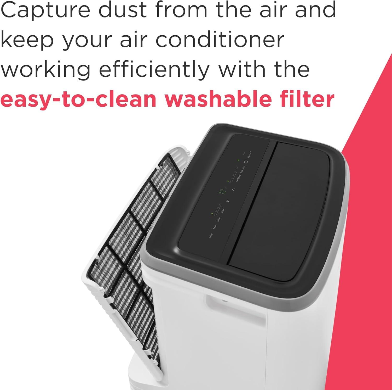 Keep your home cool and comfortable with the Frigidaire FHPC102AC1 10,000 BTU (ASHRAE) / 6,500 BTU (DOE) 3-in-1 portable room air conditioner. Operating at 115V and 930W, this energy-efficient AC unit is designed to cool areas up to 450 sq. ft. Enjoy optimal cooling with an auto swing louver, adjustable fan speeds, and a programmable 24-hour timer, allowing you to customize your comfort. Remove excess moisture from the air with dehumidifying Dry Mode and benefit from added energy savings with Sleep Mode. With a quiet performance at 49 dBA, you can enjoy a peaceful space without disruptions. Maintenance is simple with the easy-to-clean washable dust filter, while the Clean Filter alert keeps you informed to ensure your air conditioner performs optimally. The built-in air ionizer reduces airborne particles and the convenient remote control allows you to adjust settings from anywhere in the room. Experience ultimate comfort with this Frigidaire air conditioning unit.
