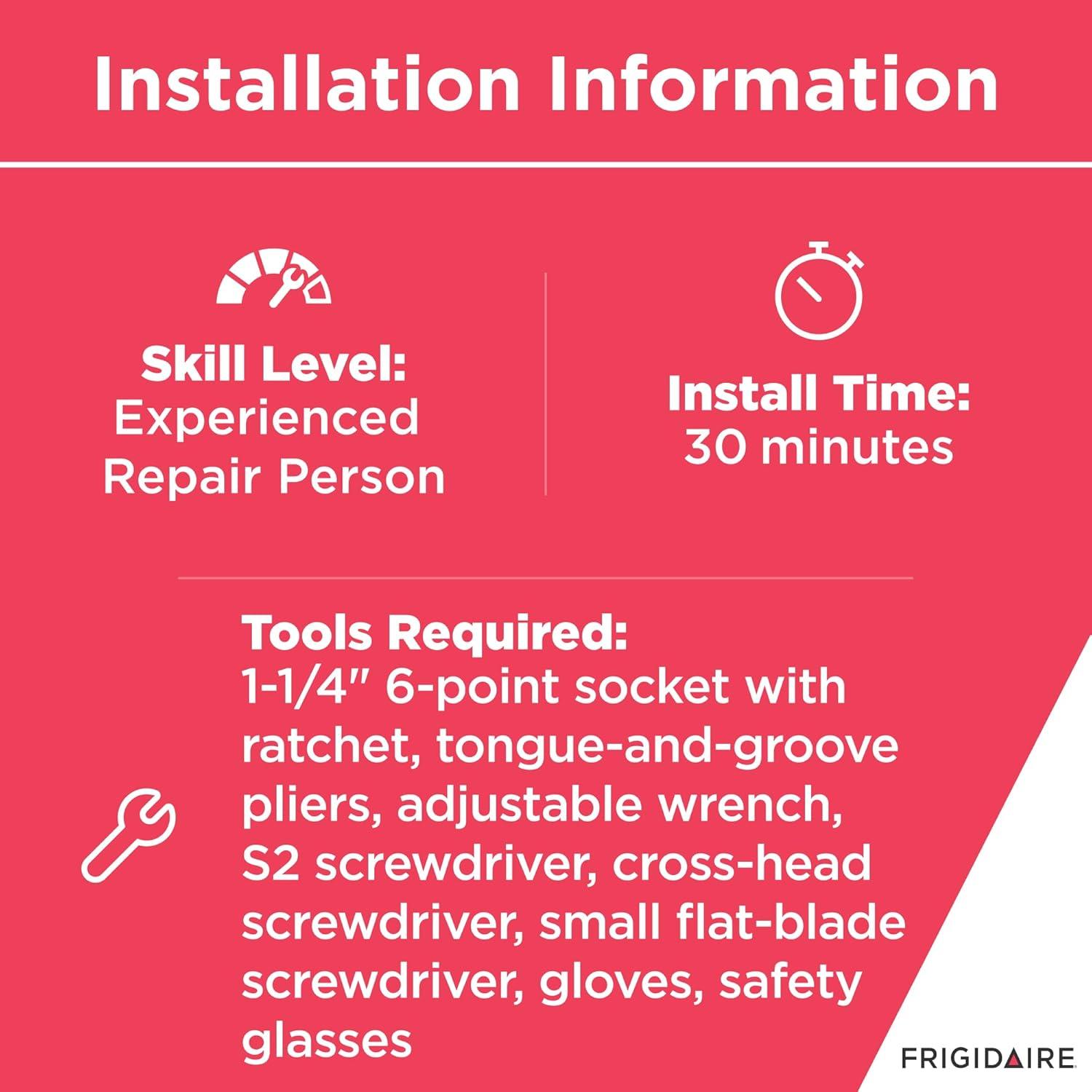 Tools Required: To install this item, you'll need the following: 1-1/4″ 6-point socket with ratchet, tongue-and-groove pliers, adjustable wrench, S2 screwdriver, cross-head screwdriver, small flat-blade screwdriver, gloves, safety glasses