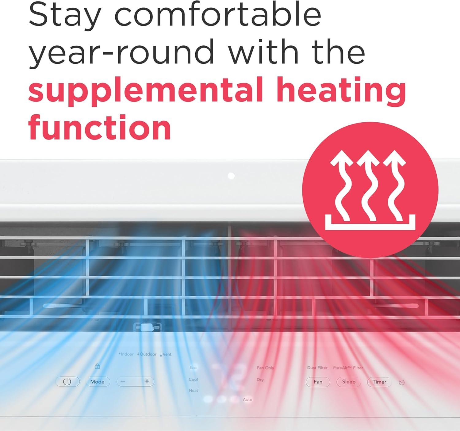 Frigidaire 8,000 BTU Window Air Conditioner with Supplemental Heat, Cools & Heats Up to 350 Sq. Ft., Remote Control, Quiet Operation, Eco Mode, 3 Fan Speeds, White(12 000 BTU)