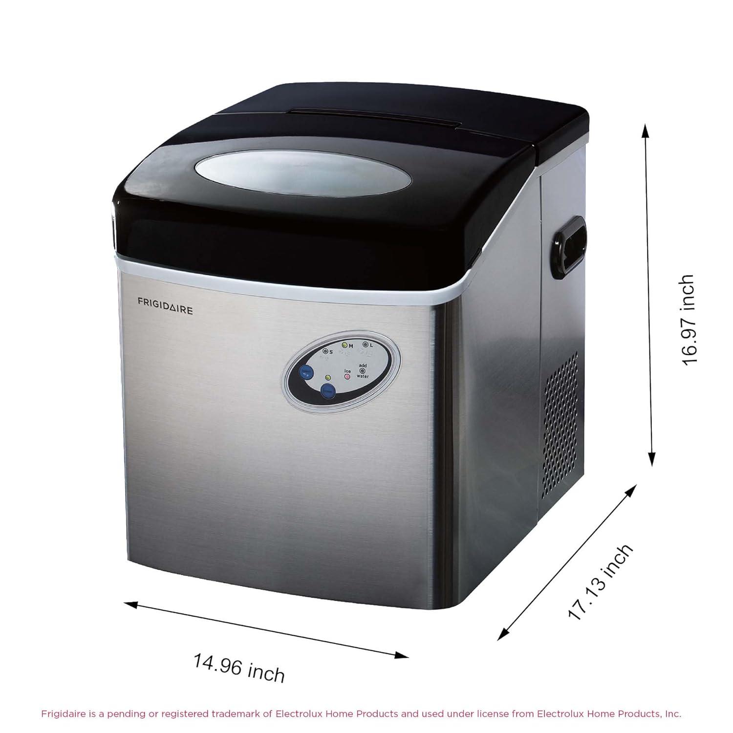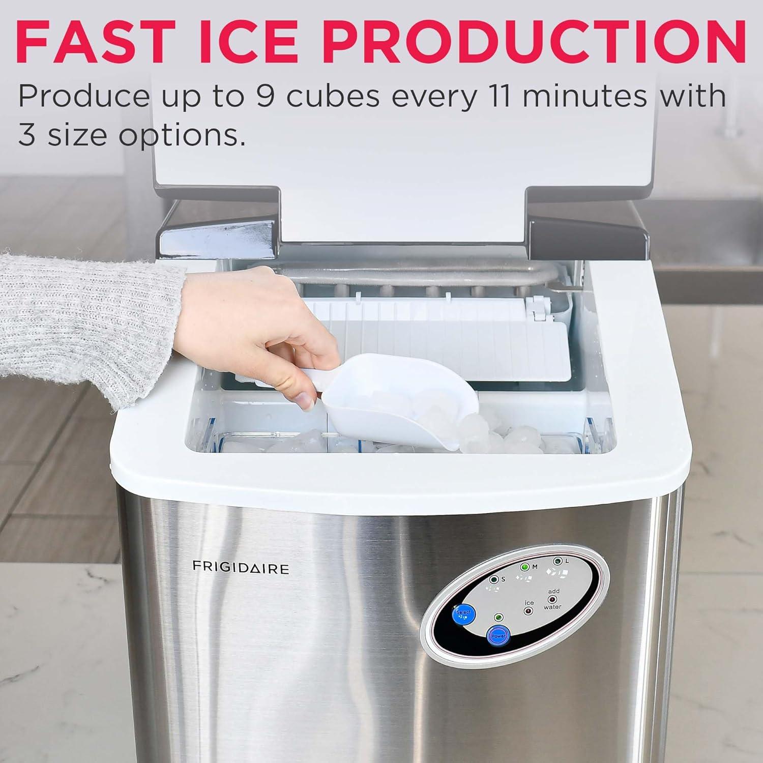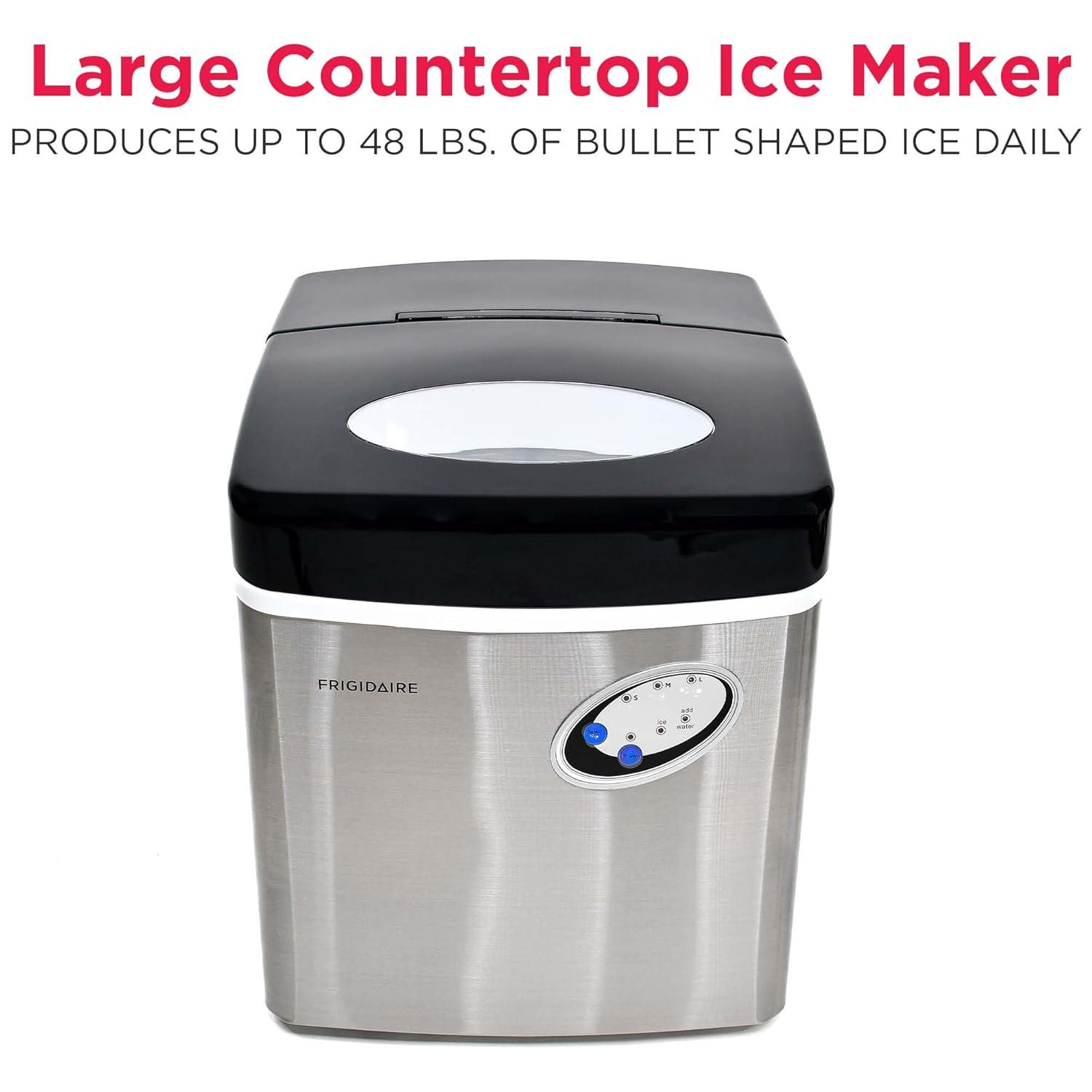 Sleek Design – Never run out of ice again with the Frigidaire Stainless Steel Ice Maker that produces up to 48 lbs. of ice per day. Elevate your space with its sleek stainless steel countertop design that blends seamlessly with any kitchen, bar, office, or dorm.