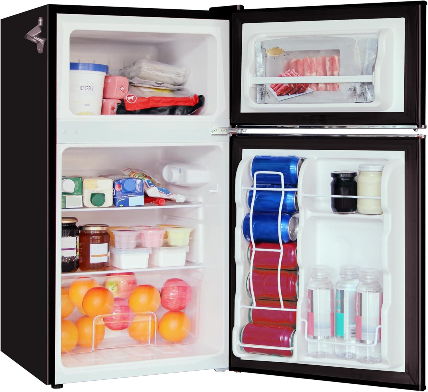 PLENTY OF STORAGE: This 3.2 Cu Ft mini fridge has a lot of storage with a .25 Cu Ft freezer with ice cube tray. Refrigerator compartment has a crisper drawer and 2 shelves. Side can dispenser for soda and drinks. Bottle opener on the outside of the fridge.