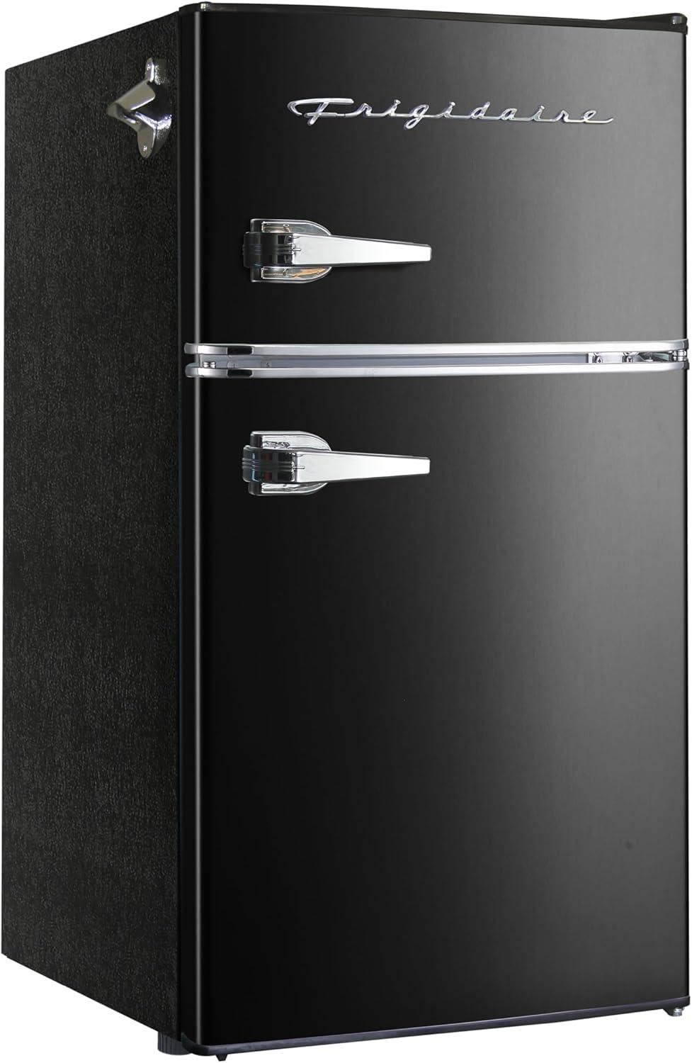 Keep snacks fresh in this 3.2 cu. ft. two-door Frigidaire bar refrigerator. The flush-back design lets you place it close to the wall to save space, and the handy built-in bottle opener eliminates the need to search through gadgets. The silver decorative embellishments on this black Frigidaire bar refrigerator convey a sleek, stylish look.